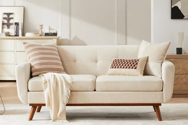 The centerpiece of most MCM living rooms is a low-profile sofa in a warm, earthy fabric.