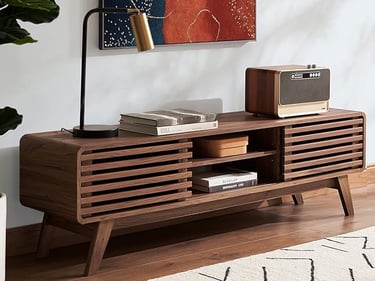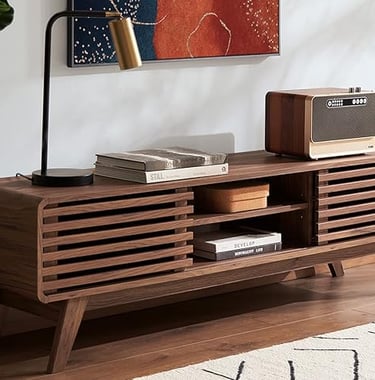 Wood is one of the strongest elements in this design style. A walnut or teak-inspired media console or coffee table instantly transforms the space.