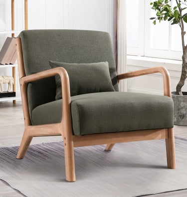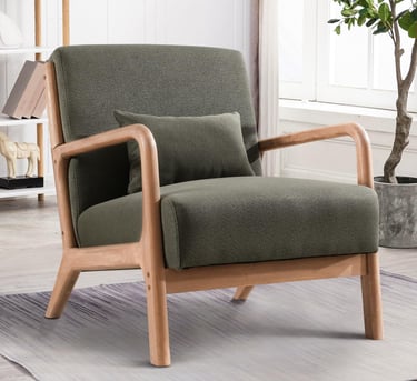 Mid-century modern style mixes clean lines with cozy curves. A green or neutral accent chair adds comfort and visual interest.